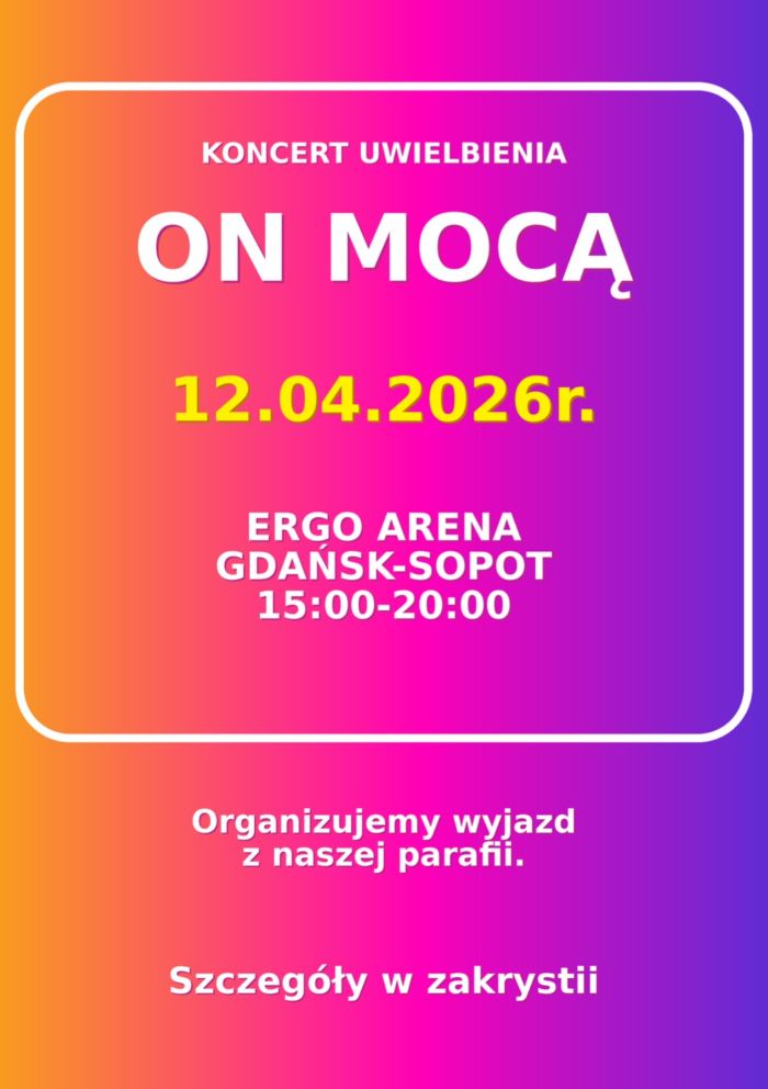 Niedziela Wielkanocna – 05.04.2026 – Procesja Rezurekcyjna o godz. 6,00 i Msza św. Zmartwychwstania Pańskiego - W Wielkanoc nie będzie Mszy św. o godz. 7,. Pozostałe Msze św. o godz. 9,00; 11,00; 17,00.